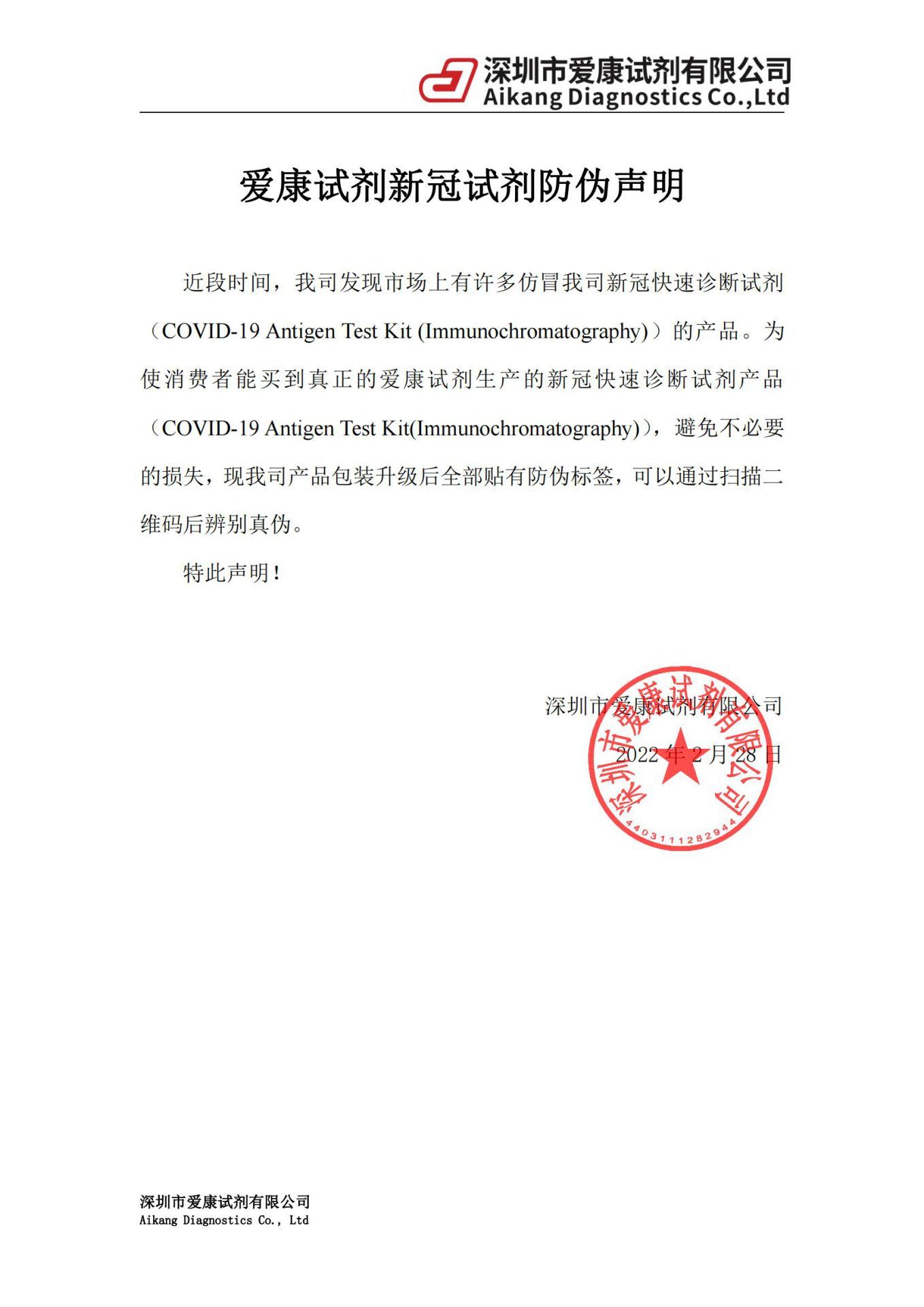 关于我司(深圳市爱康试剂有限公司,以下简称“爱康试剂”)新型冠状病毒快速检测试剂盒产品声明如下: